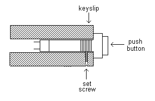 They can be seen fitted to the keyboards of the console shown in the right hand picture of Figure 1. In this case I discarded the nuts and washers provided and inserted the body of the push buttons into close-fitting holes bored with a pillar drill through the decorative wood keyslip and into the keybed behind so that the connecting wires could emerge from the rear (Figure 4). They were prevented from rotating by means of small brass countersunk woodscrews inserted gently from below. These had their sharp ends burred off smoothly to avoid damaging the button itself. Most of the pistons on this console are black but two red ones were fitted to the extremities of the lower keyboard to act as the combination capture setter button and a general cancel piston. An advantage of these buttons is that the diameter of the mounting hole is much less than that required for a barrel type of thumb piston, thereby inflicting less mutilation to the keybed and weakening it. This assumes particular importance when a large number of pistons are required. If your keyboards only have a thin vertical keyslip panel rather than one backed by the type of extended keybed discussed here, you can still fix the buttons easily by using the nuts and washers supplied. Therefore they are flexible in the sense of catering for different mounting options.